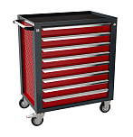 Тележка состоит из 8 ящиков. Ящики оснащены фиксирующими защелками, которые предотвращают случайное открывание. Усиленные колеса из термопластичного каучука. Все ящики оснащены роликовыми направляющими, полностью выдвигаются и легко вынимаются из тележки.