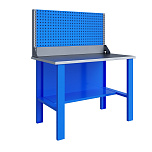 Верстак комплектуется полкой-стенкой, расположенной под столешницей для удобного размещения габаритного инструмента и оснастки. Опорные элементы выполнены сварными из холоднокатаной стали. Все металлические элементы покрыты полиэфирной порошковой краской. Столешница из фанеры толщиной 24 мм, которая покрыта листом оцинкованной стали толщиной 1,2 мм. Глубина столешниц 696 мм. Максимальная масса груза на столешнице - 350 кг.