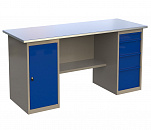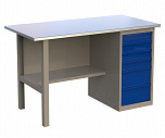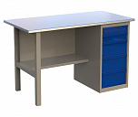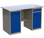 Стол бестумбовый поставляется в разобранном виде (4 места). Нагрузка на столешницу до 600 кг. Стандартный цвет: корпус - серый глянец RAL 7030, ящики и двери тумб - синий RAL 5017. Размеры: 855х1200х700мм. Вес: 40 кг.