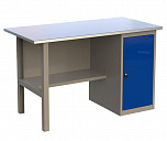 Однотумбовый. Допустимая нагрузка на столешницу 750 кг. Опорные элементы выполнены сварными из холоднокатаной стали. Верстак состоит из опоры, тумбы P7 с дверью и двумя полками и полки-стенки. Все металлические элементы покрыты полиэфирной порошковой краской. Столешница состоит из фанеры марки ФСФ толщиной 24 мм, которая покрыта лаком-антисептиком и листом оцинкованной холоднокатаной стали толщиной 1,2 мм. Размеры (ВхШхГ) 855x1196x696 мм.