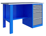 Однотумбовый. Допустимая нагрузка на столешницу 750 кг. Опорные элементы выполнены сварными из холоднокатаной стали. Верстак состоит из столешницы, опоры, тумбы P4 с двумя малыми и двумя большими ящиками, полки-стенки и одинарного экрана с кронштейнами. Все металлические элементы покрыты полиэфирной порошковой краской. Столешница из фанеры марки ФСФ толщиной 24 мм, которая покрыта лаком-антисептиком и листом оцинкованной холоднокатаной стали толщиной 1,2 мм. Размеры (ВхШхГ) 1470x1196x696 мм.