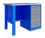 Однотумбовый. Допустимая нагрузка на столешницу 750 кг. Опорные элементы выполнены сварными из холоднокатаной стали. Верстак состоит из столешницы, опоры, тумбы P3 с тремя большими ящиками и полки-стенки. Все металлические элементы покрыты полиэфирной порошковой краской. Столешница состоит из фанеры марки ФСФ толщиной 24 мм, которая покрыта лаком-антисептиком и листом оцинкованной холоднокатаной стали толщиной 1,2 мм. Размеры (ВхШхГ) 855x1396x696 мм.