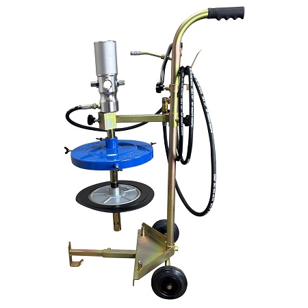 Нагнетатель пневматический, для густой смазки. Комплект оснащен тележкой для бочек 20-60 кг., пневматический насос для смазки 50:1 производительностью 800гр/мин, мембрана и крышка для солидолонагнетателя, шланг 4 м, раздаточный пистолет с наконечником. При давлении воздуха 6-8 Атм давление смазки 400 Атм максимально. Колёса: 2 прямых. Масса: 16 кг.