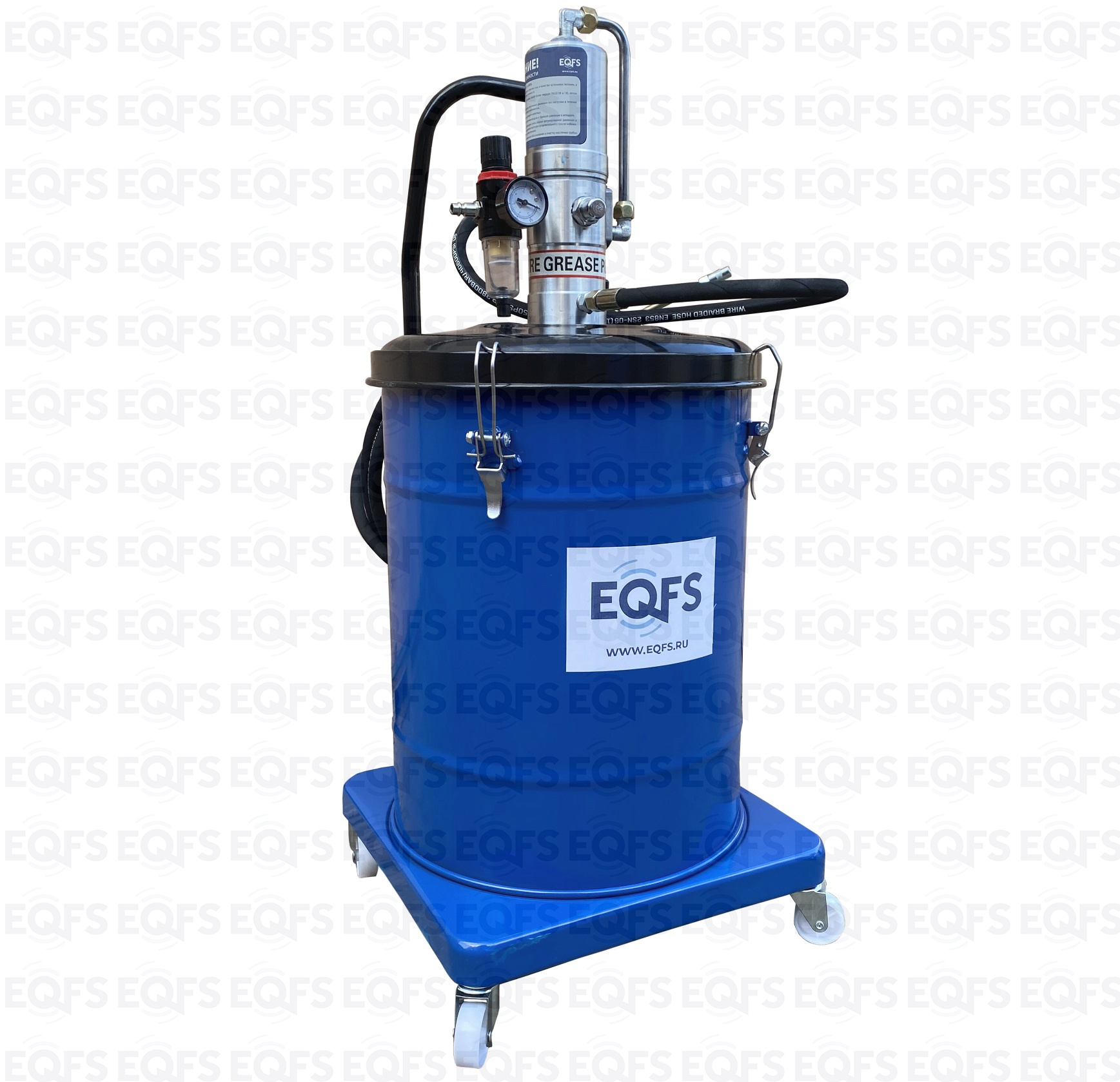 Корпус нагнетателя смазки – стальной, насос изготовлен из анодированной стали. Фиксация насоса с крышкой к баку для смазки производится с помощью металлических защелок с резьбой. Для удобства транспортировки нагнетатель оборудован металлической ручкой в верхней части корпуса. Нагнетатель оборудован маслобензостойким армированным шлангом длиной 4 м. Солидолонагнетатель для консистентной смазки, установленный на колесах, имеет легкий вес и экономичную конструкцию для удобства перемещения и эксплуатации.