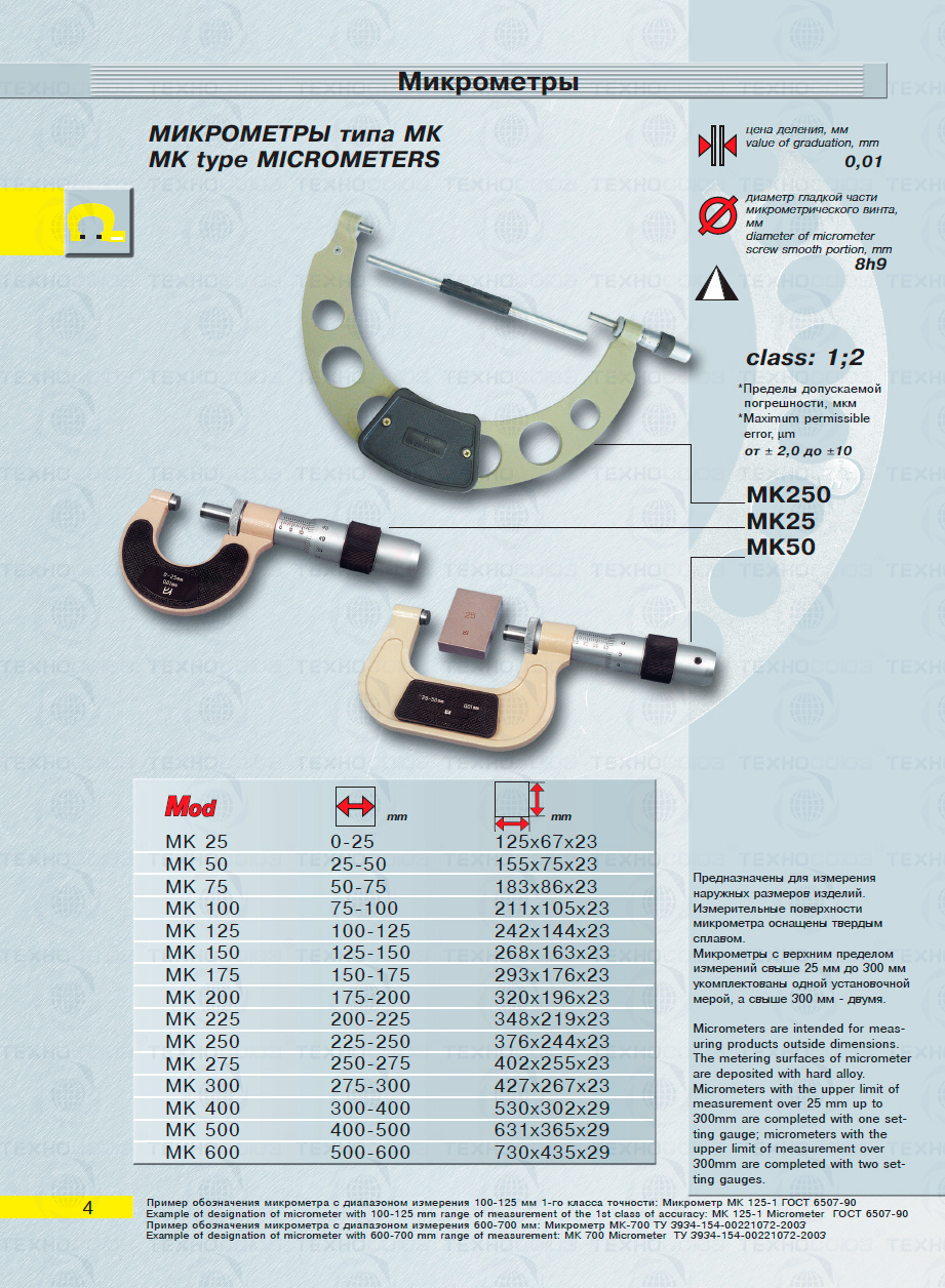 Цена деления 0,01 мм. Диапазон измерения от 400-500 мм. Для измерения наружных размеров изделий. Измерительные поверхности микрометра оснащены твердым сплавом. Микрометры укомплектованы установочная мера 2 шт. Класса точности 1. ГОСТ 6507-90. Поставляется в двух вариантах с поверкой и без поверки!