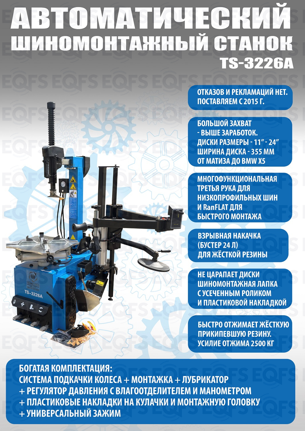 Автоматического шиномонтажного стенда TS-3226А предназначен для монтажа и демонтажа шин легковых автомобилей, внедорожников и легких грузовиков с размером колес от 11-24 дюйма. Усилие пневмоцилиндра в 2500 кг. В комплекте: полноценная 3-я рука для работы с жесткой и низкопрофильной резиной RUNFLAT. + встроенный бустер 24 литра (взрывная подкачка) + пистолет для подкачки шин + монтажка + регулятор давления с влагоотделителем и манометром. Напряжение шиномонтажных станков 220В или 380В на выбор. Гарантия 18 мес – наш монтаж, 12 мес – самостоятельная установка.