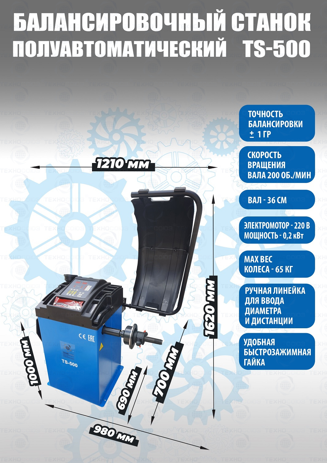 + TS-500 Балансировочный станок для колес легковых автомобилей, мотоциклов и легких грузовиков. В комплекте: кожух с автозапуском + клещи + кронциркуль + быстрозажимная гайка + набор конусов. Для балансировки для колес легковых автомобилей, мотоциклов и легких грузовиков с диаметром диска с резиной до 760 мм. Размеры диска: ширина 3–9” (76-228 мм) , диаметр диска" - 10–21” (254-533 мм). Вал-36 мм. Максимальный вес колеса с диском – 65 кг. Точность ±1гр. Напряжение 220В. C кожухом. Напряжение 220В. позволяет производить шиномонтаж и балансировку колес. Данные станки возим более 10 лет. Надежные - не подведут в сезон!!! Напряжение шиномонтажных станков 220В или 380В на выбор.