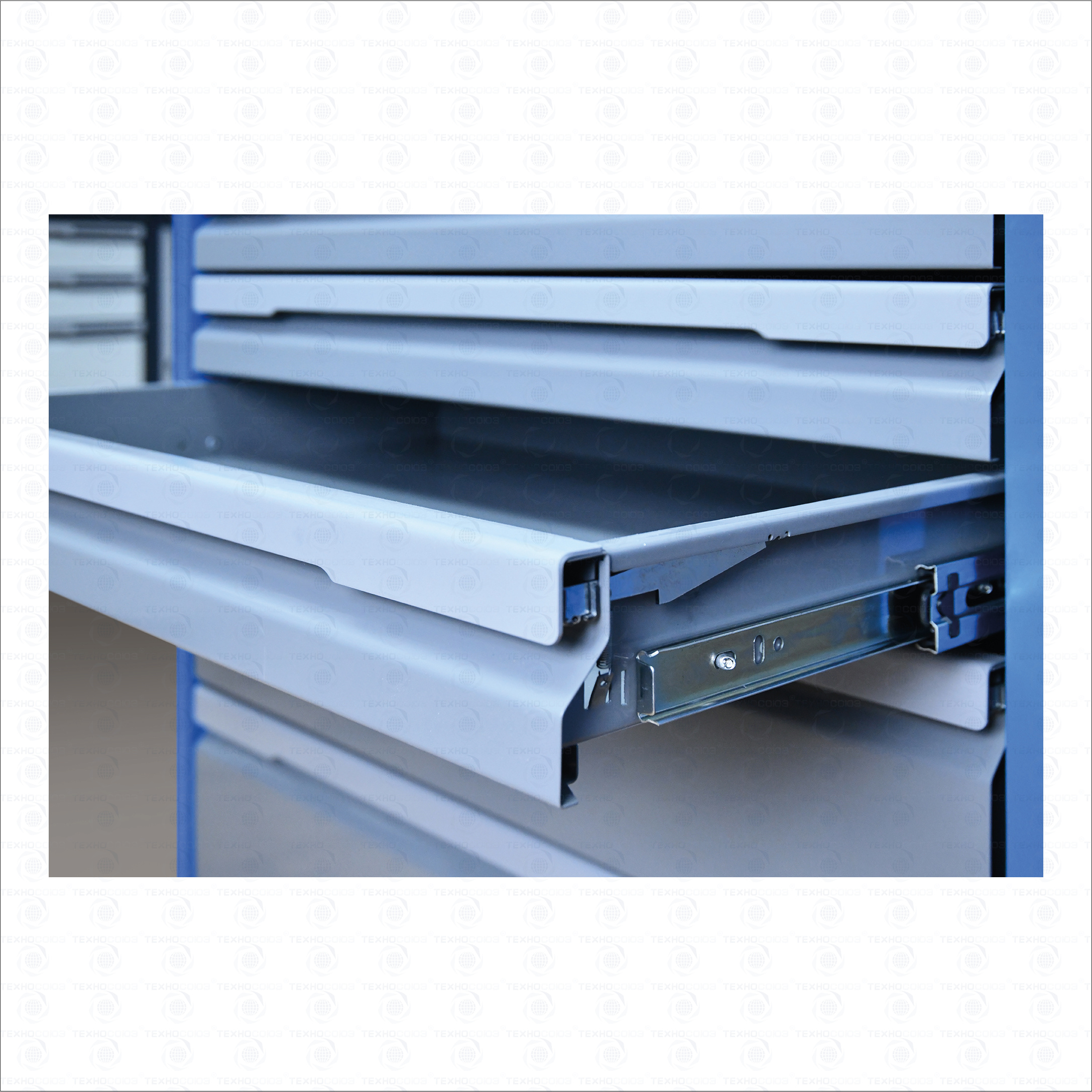 Ящики устанавливаются на шариковых телескопических направляющих полного выдвижения. Обеспечен свободный и плавный ход ящиков даже при полной загрузке. На лицевой панели каждого ящика установлена ручка-накладка. Каждый ящик снабжен клавишной системой антиоткрывания из оцинкованной стали, препятствующей самопроизвольному выдвижению ящиков, например, при наклоне или перемещении тележки.