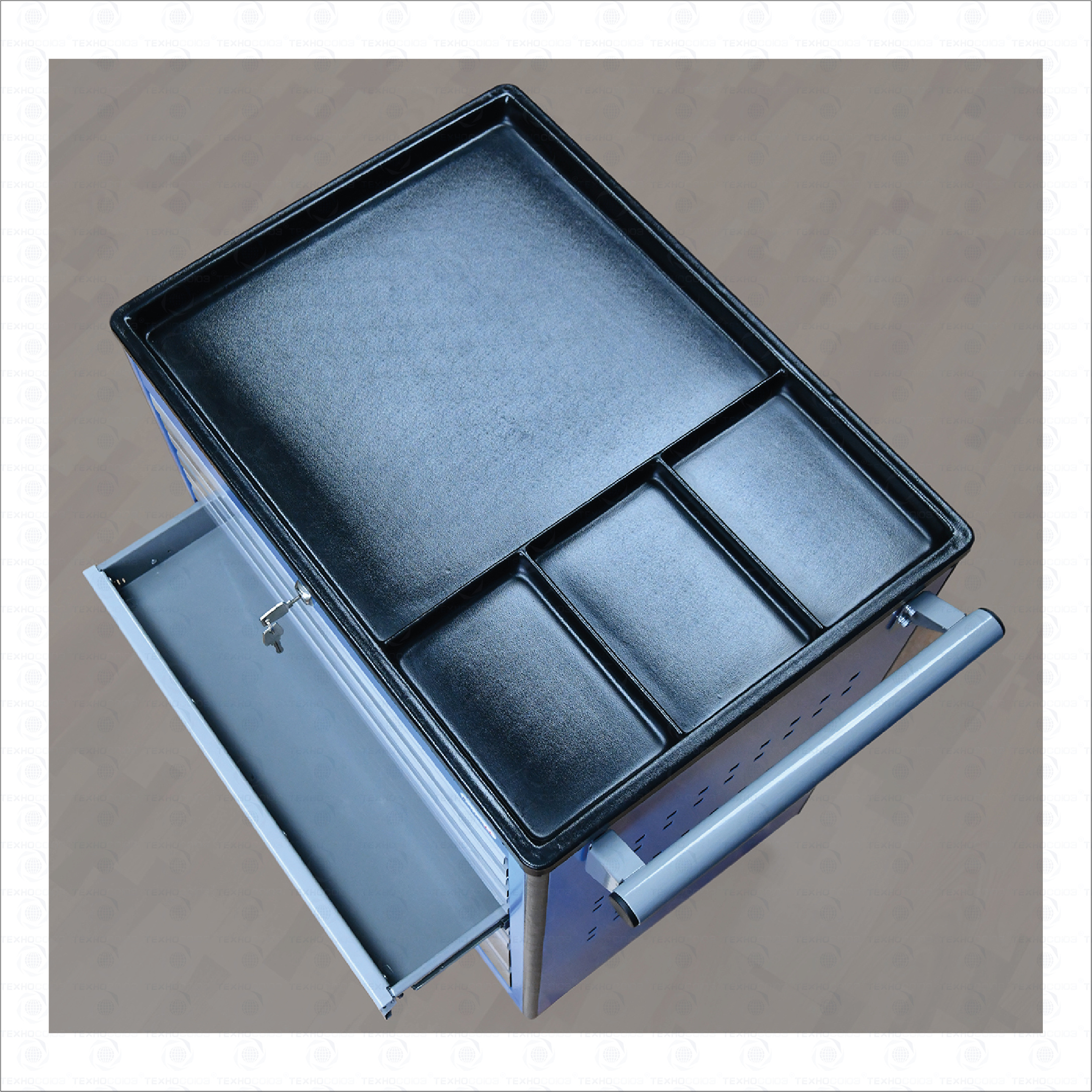 Все металлические элементы тележки покрыты полиэфирной порошковой краской, обеспечивающей хорошую износостойкость покрытия и стойкость его к моющим средствам и смазочным веществам. Цвет и текстура покрытия корпуса тележки RAL 5015, полуматовое. Цвет и текстура покрытия ящиков тележки RAL 7037, глянцевое. Цвет и текстура покрытия накладок на ящики RAL 9006, глянцевое.