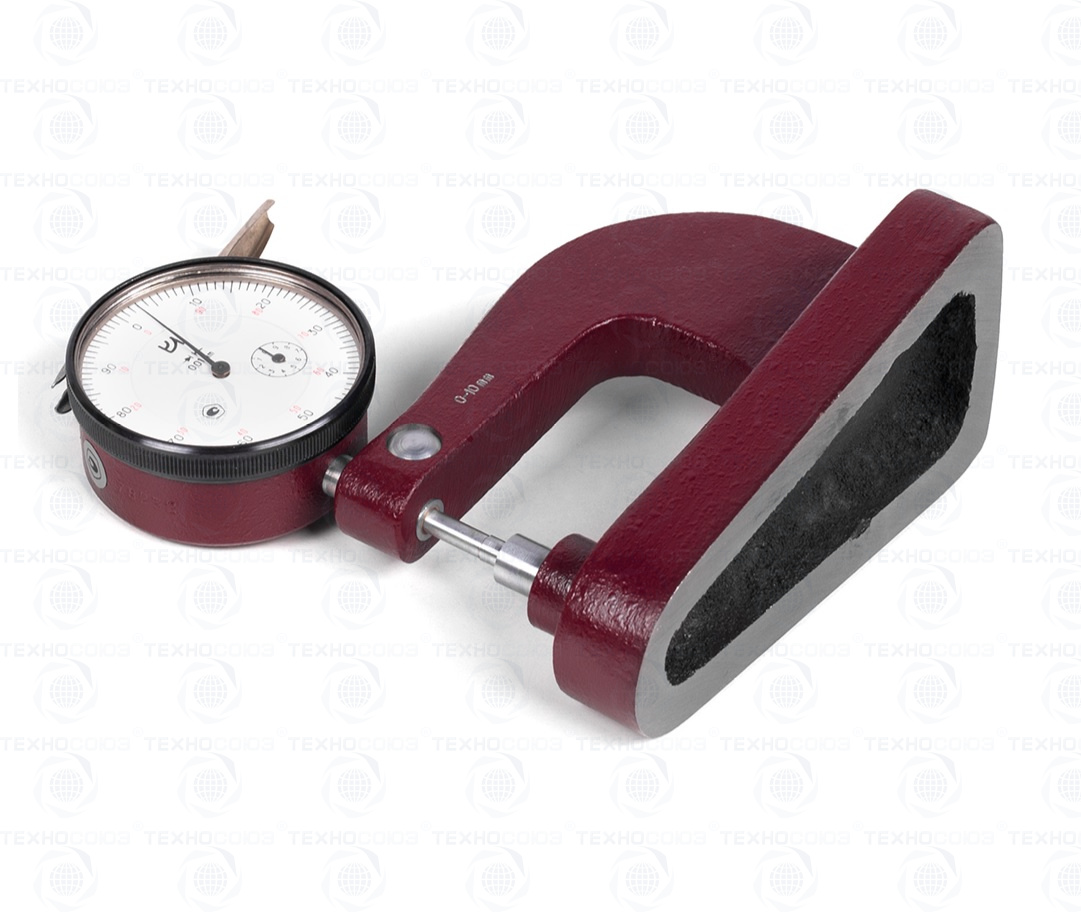 Толщиномер представляет собой скобу, в которой сверху расположено отсчетное устройство с измерительным наконечником , а снизу запрессована пятка. Настольные толщиномеры имеют поверхность для установки на плоскости.