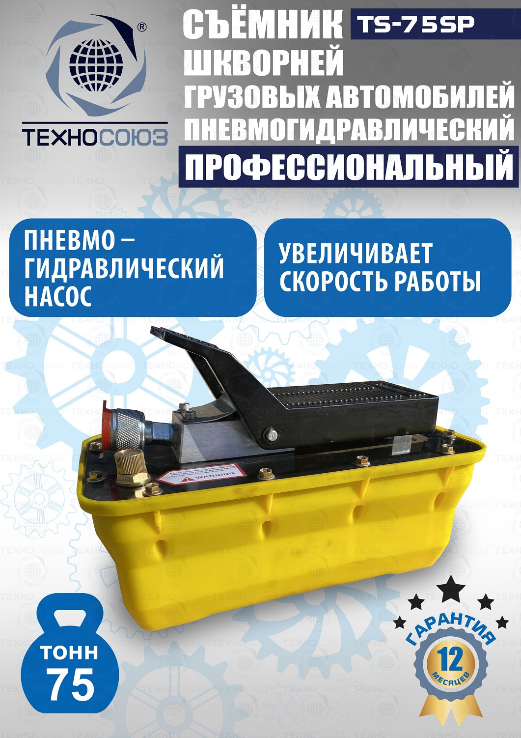 Сокращает время ремонта. Позволяет работать под разными углами. Для выпрессовки шкворней из поворотной цапфы погрузчиков, тракторов, строительной техники, коммерческих и грузовых авто отечественного и импортного производства: MAN, MERCEDES, SCANIA, VOLVO, Корейские и Китайские авто. Пневмогидравлический привод. Рабочее окно 400x320 мм. Усилие 75 тонн.